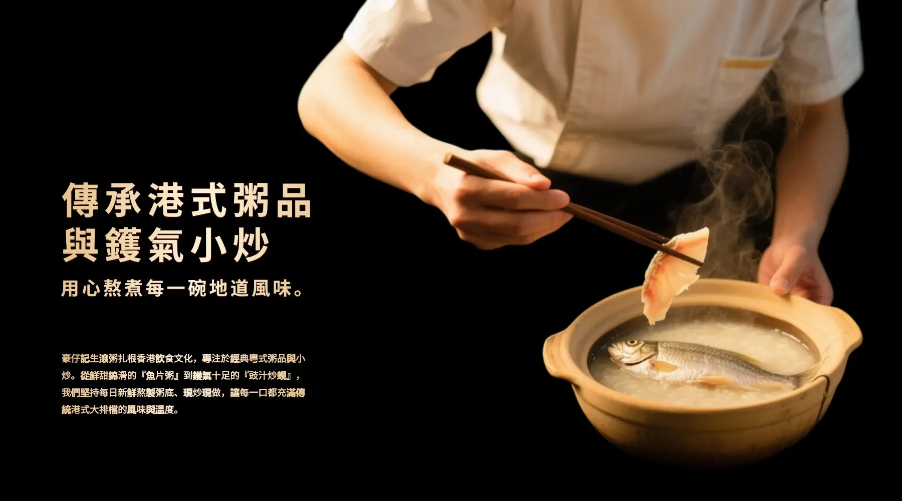 「豪仔記生滾粥——傳承港式粥品與鑊氣小炒,用心熬煮每一碗地道風味。」