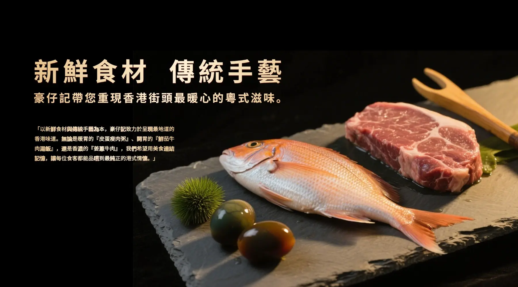 「新鮮食材,傳統手藝,豪仔記帶您重現香港街頭最暖心的粵式滋味。」